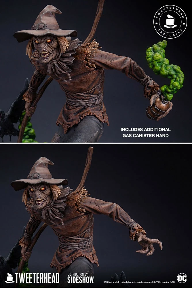 The “Exclusive Edition” comes with an additional left hand holding a fear toxin canister. With this Exclusive part there are 4 different ways you can display your Scarecrow Maquette!