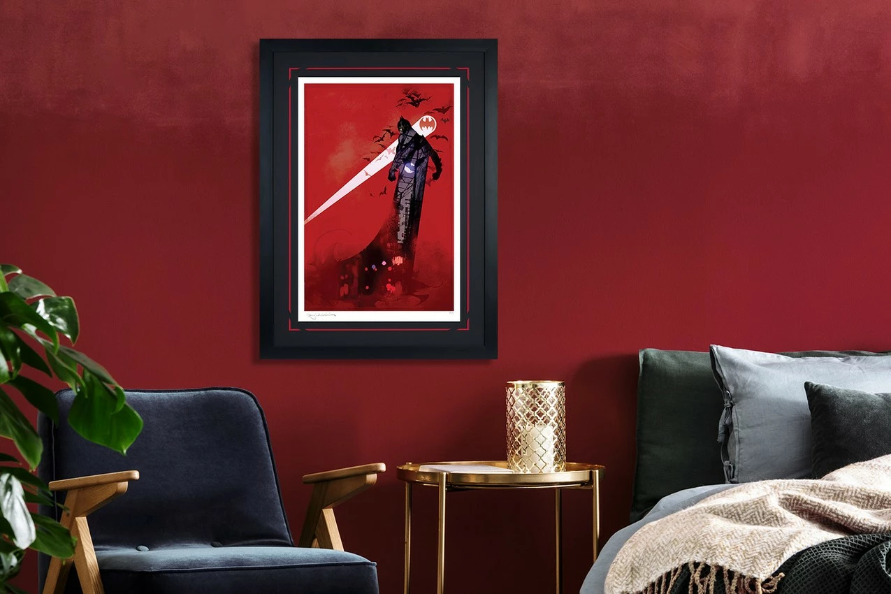 A shadowy specter, Batman turns toward the Bat-Signal as it shines like a full moon against a red-drenched sky. Batman’s namesake nocturnal creatures surround him in a powerful whirlwind. Meanwhile, his eyes are affixed toward the Bat-Signal’s origin, a building far in the distance, and his fists are clenched tight as he prepares to descend. Swept up in Batman’s translucent black cape is an abandoned alleyway that opens up to neon nightlife — far beneath him, yet woven into the fabric of his very being.