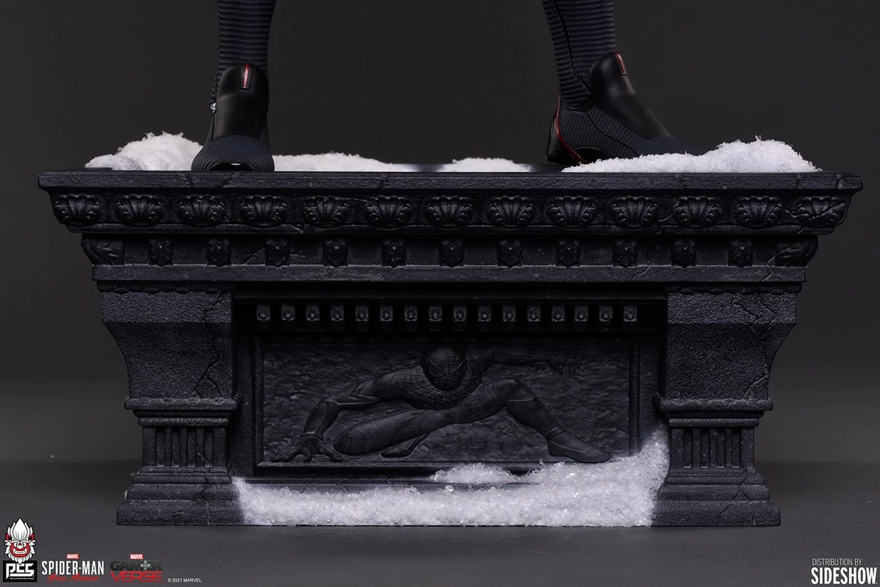 The Spider-Man: Miles Morales 1:3 Scale Statue measures 29.5” tall and 12” wide as the teenage Marvel super hero stands on a snow-capped roof above his Harlem neighborhood. The building beneath his feet is detailed with stone-like architecture, snowy effects, and bas-relief Spider-Man symbols on the sides. As the newly minted Spider-Man, Miles rises to his new role as a hometown champion, protecting the block with his incredible powers and love for his community.