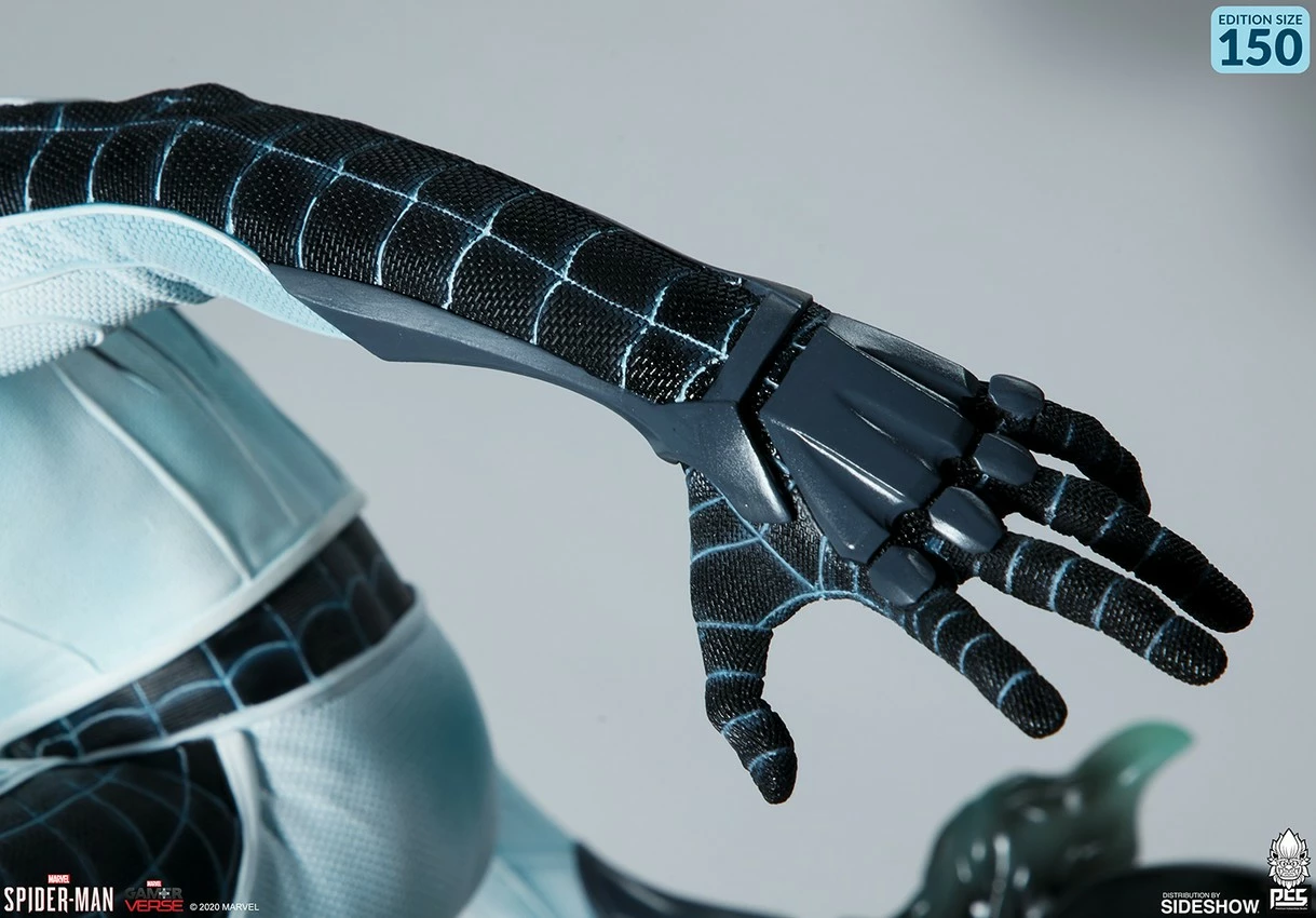 The Spider-Man Negative Zone Suit 1:3 Scale Statue features a fully sculpted costume based on the incredible color negative costume design featured in Marvel’s Spider Man. The Negative Zone Suit features a black and white inverted color scheme, black spider symbols on the chest and back, and unique teal shading throughout in order to recreate the mesmerizing movement of the game’s negative energy effects. Additionally, the figure features detailed webbed and paneled costume sections, sculpted with realistic textures to further give the appearance of suit fabric.