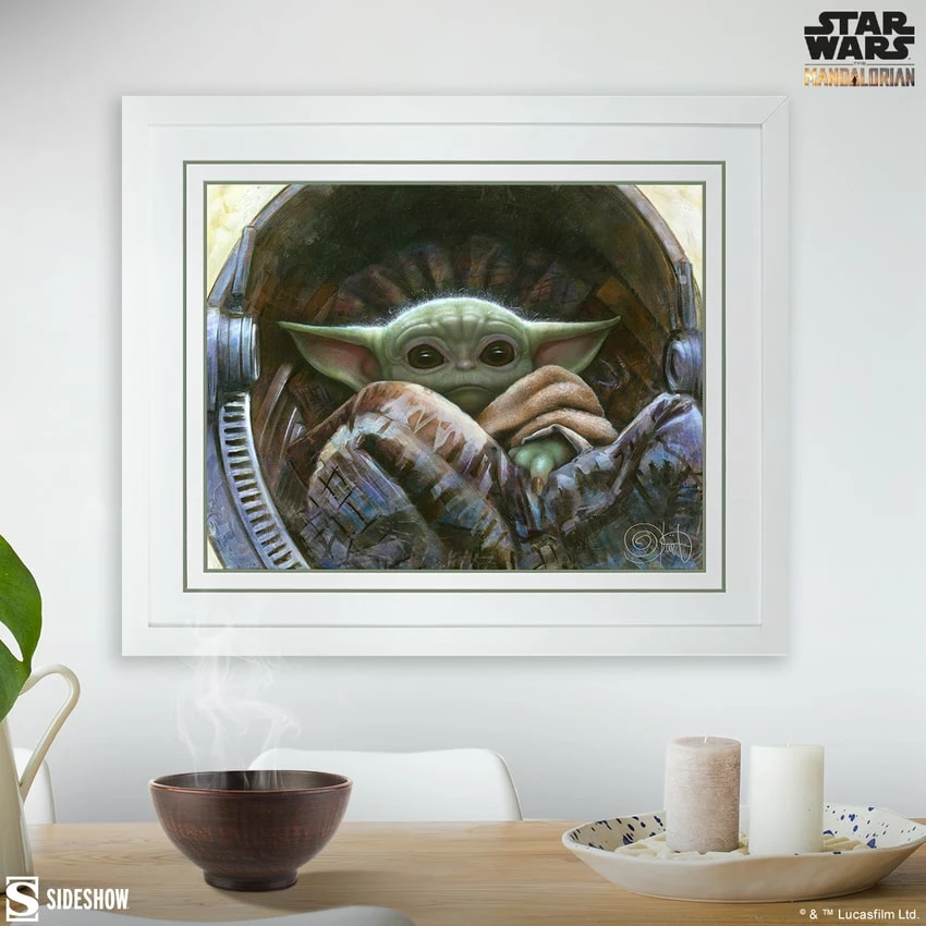 Relive the moment when you (and the entire galaxy) first fell in love with The Child, lovingly referred to by fans as “Baby Yoda”, from Star Wars™: The Mandalorian. This incredibly detailed portrait by artist Olivia captures the innocence of the mysterious alien asset moments after it was first discovered by Din Djarin, the Mandalorian himself. With wide, wondering eyes and tiny grasping fingers, The Child pulls down the blanket within its hovering pram to gaze up at its new guardian, unknowingly forming an unshakeable clan of two.