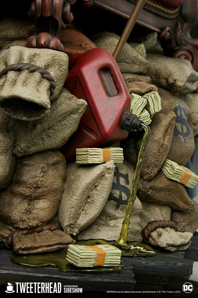 The Joker Deluxe Maquette measures close to 20.5” tall when fully assembled – from the bottom of base to the tippy top of the Batman’s cowl on the chair. This fully sculpted polyresin statue comes crammed with a bunch of craziness – The Joker sitting atop his personalized throne with a Bat-cowl and cape, armed with his cane and bladed shoe. All nested on a giant pile of money bags, gasoline tanks, bombs, and endless knick-knacks and easter eggs, you’ll probably never stop finding something new to love in this DC Comics collectible piece.