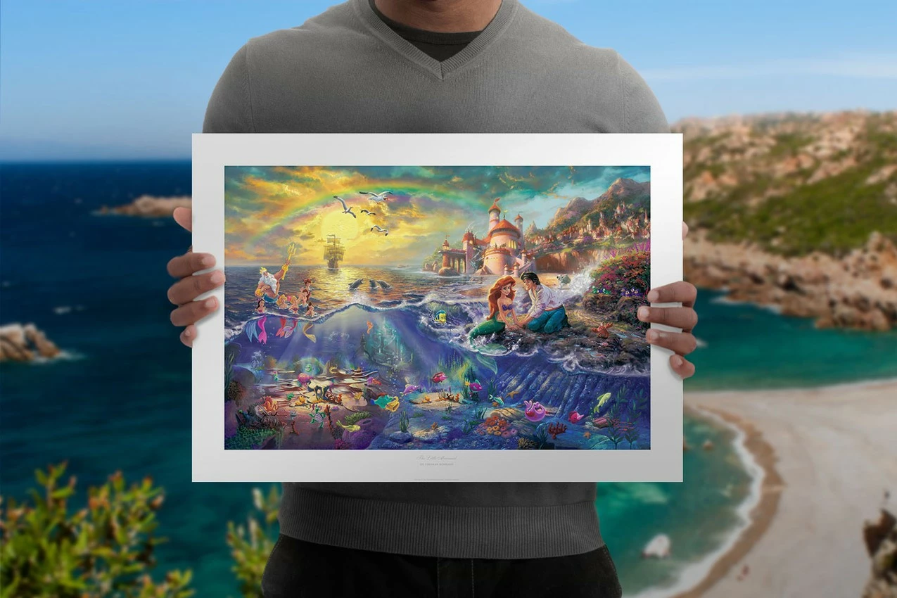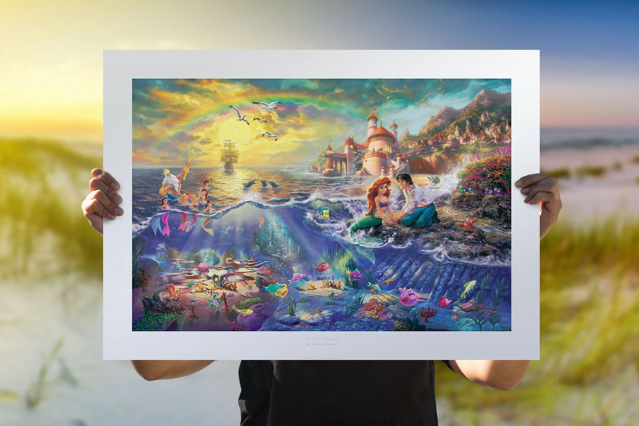 The Little Mermaid unframed limited edition paper print by Thomas Kinkade Studios features premium heavy weight 100 lbs paper, long-life pigment inks that outperform conventional press inks and an individually numbered certificate of authenticity matched to the art piece.
