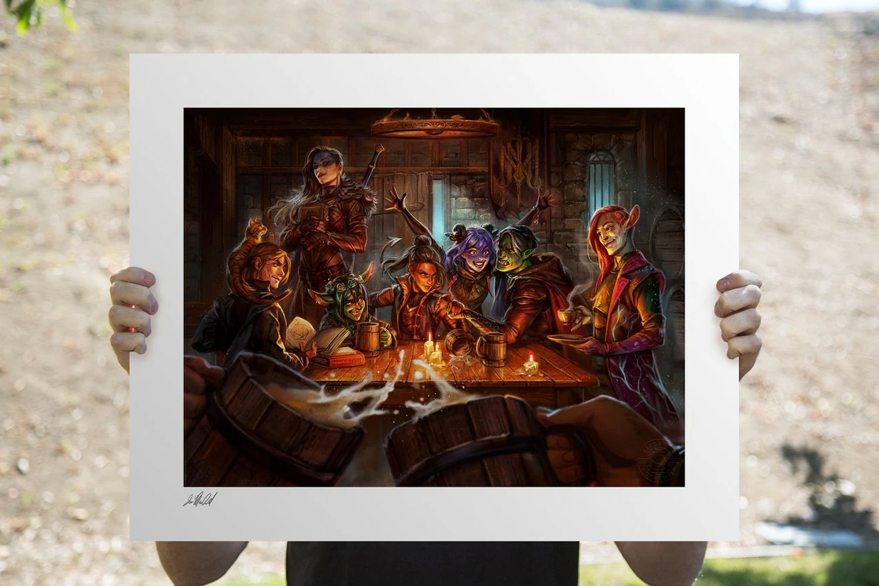 Raise your tankard or your teacup as a toast to the intrepid adventurers of the Mighty Nein in their journey across the continent of Wildemount. This fine art illustration features heroes Caleb (with Frumpkin), Yasha, Nott, Beau, Jester, Fjord, and Caduceus as they find respite at a local tavern, studying spells and engaging in friendly feats of strength. Make a perception check to spot the character details hidden throughout the image, including the hint of a familiar storyteller in the foreground, cheering on the Mighty Nein after another incredible quest.