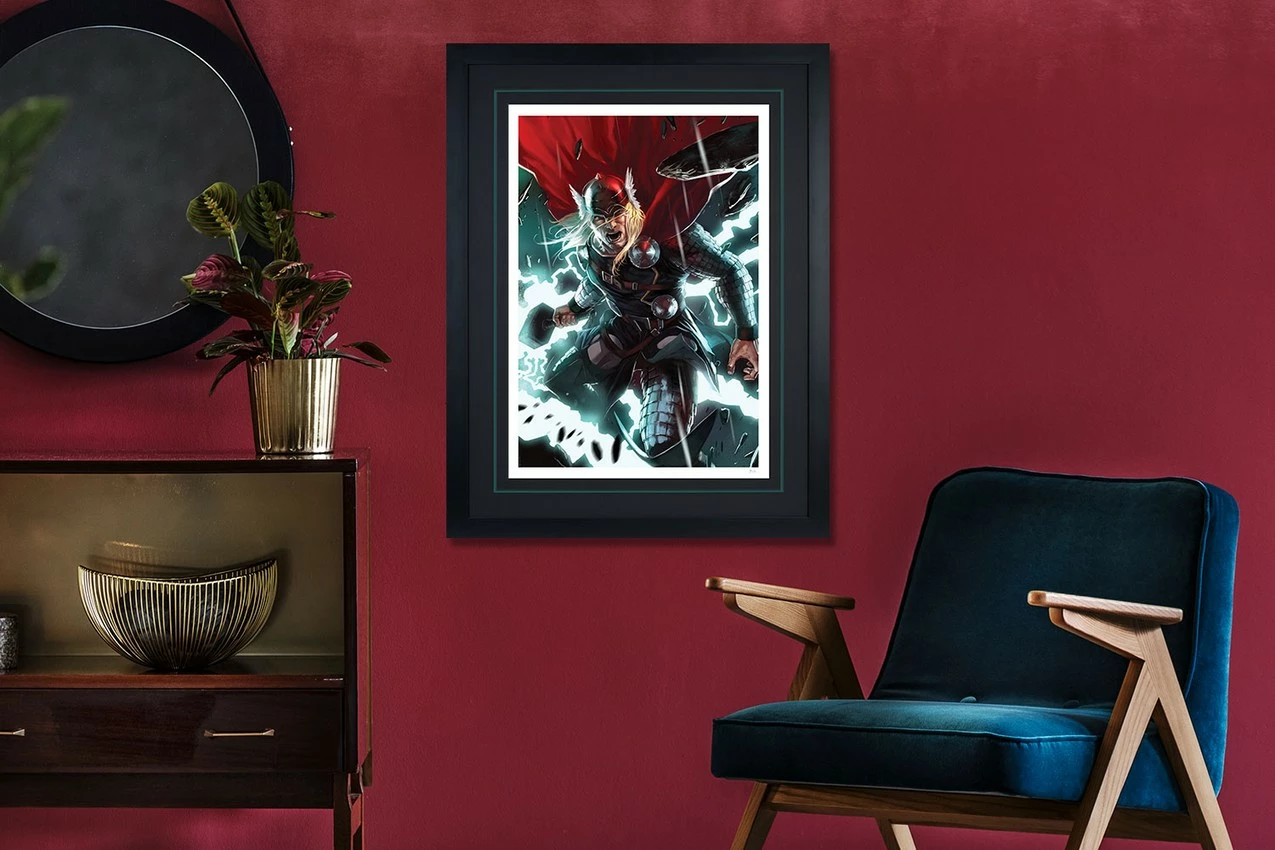 Originally created as a cover for Thor #8 (2008), written by J. Michael Straczynski for Marvel Comics, this comic book artwork is available for fans as an unframed giclée print or in a custom framed presentation. Each The Mighty Thor Fine Art Print features an embossed Sideshow Seal of Authenticity and is numbered as part of the limited edition of 150 pieces. Verily, this Thor artwork makes a worthy addition to any Marvel fan’s collection!