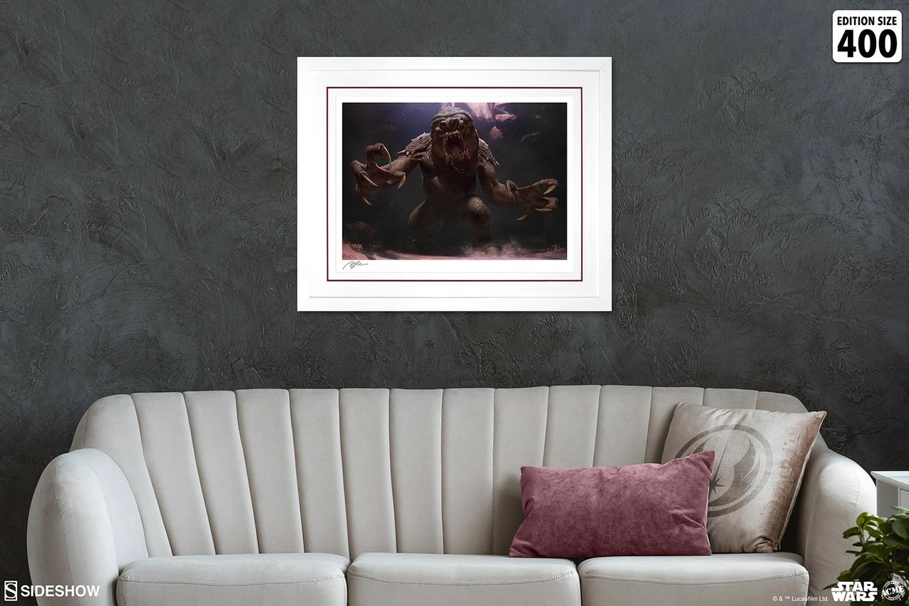 Limited to an edition of 400 pieces, The Rancor Fine Art Print features an authorized, automated artist signature and includes a Certificate of Authenticity. Based on The Rancor Deluxe Statue by Sideshow, this high-end collectible art piece makes a perfect companion to the fully realized textures and colors of the immense three-dimensional sculpt. Pair the print and the statue for a Star Wars palace display that even Jabba would be jealous of!