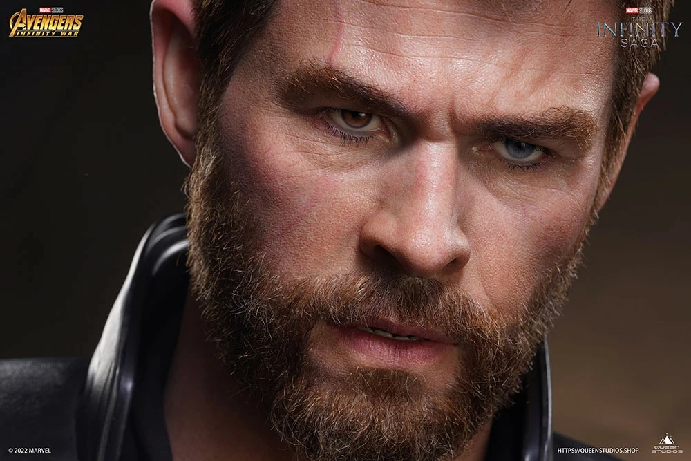 This 1:1 scale life size bust is inspired by Thor from Marvel Studios’ Avengers: Infinity War. The bust stands at 73cm tall and captures the God of Thunder with movie accurate body armor, short blonde hair, and trimmed beard. Created using state of the art technology and the finest materials, the Queen Studios team have spent countless hours on the head sculpt to capture the characters likeness with breath taking accuracy.