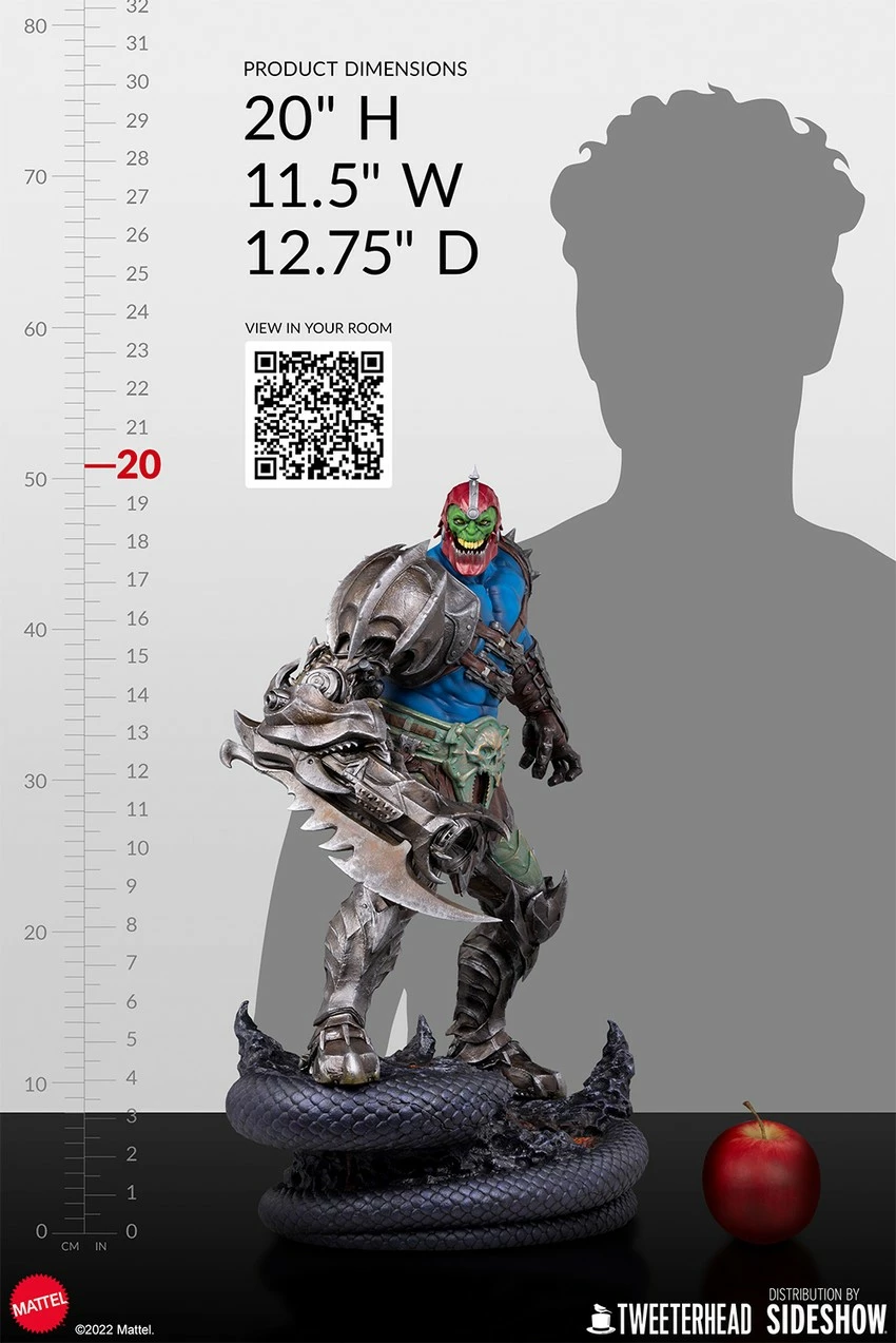 The Trap Jaw Maquette measures 20” tall, 11.5” wide, and 12.75” deep when fully assembled. He stands atop a Snake Mountain themed base, which matches with other Evil Warriors in the Legends collection like the Mer-Man Legends Maquette and the upcoming Skeletor Legends Maquette. This MOTU collectible maquette is fully sculpted and painted to reimagine his classic appearance with an even more intimidating new style.