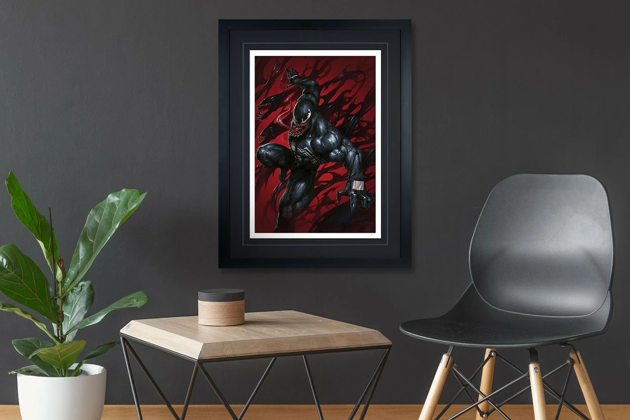 Originally created as a variant cover for Venom #1 (2018), written by Donny Cates for Marvel Comics, this comic book artwork is available for fans as an unframed giclée print or in a custom framed presentation. Each Venom Fine Art Print features an embossed Sideshow Seal of Authenticity and is numbered as part of the limited edition of 150 pieces. This sinister portrait of the lethal protector is a must have for Spider-Man artwork collectors or Venom enthusiasts in general.