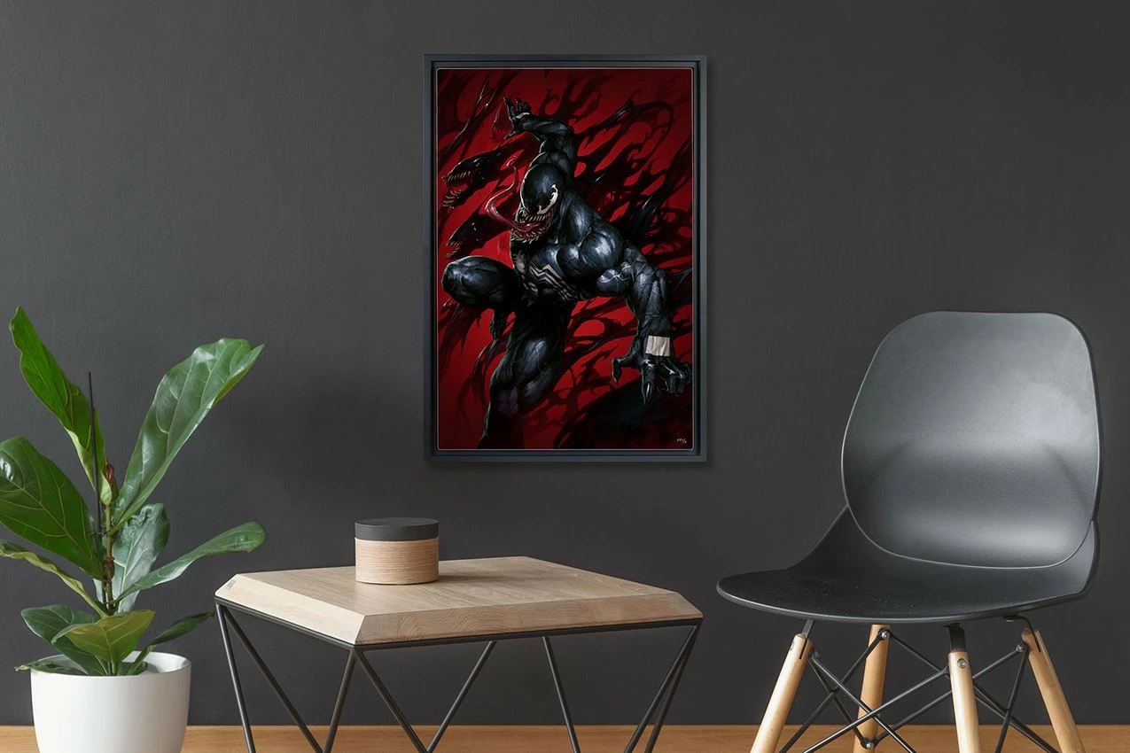 Originally created as a variant cover for Venom #1 (2018), written by Donny Cates for Marvel Comics, this comic book artwork is now available for fans in a numbered limited edition of only 50 pieces. Each Venom HD Aluminum Metal Art Print has a glossy surface that is durable, scratch-resistant, and easy to clean. The piece comes professionally finished in a matte black floating frame with a wire hanger for ease of display, making this sinister portrait of the lethal protector a must have for Spider-Man artwork collectors or Venom enthusiasts in general.