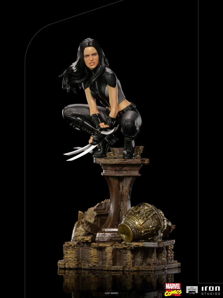 With her razor-sharp claws, fists, and feet unsheathed, the young mutant heroine poses on the rubble of demolished Mansion X, leaning on the remains of a wooden pillar, with an urn containing an ancestor’s ashes lying at her feet. She prepares to jump in and unleash all her fury against the invading forces at her home led by Magneto, the villain-controlled Sentinel Robots, and their followers, and defend her adoptive family, the X-Men, and their allied group X-Force. Expanding the largest collection of Marvel mutant heroes statues ever produced, Iron Studios introduces “X-23 – X-Men – BDS Art Scale 1:10 Statue” featuring the lethal Wolverine heiress.