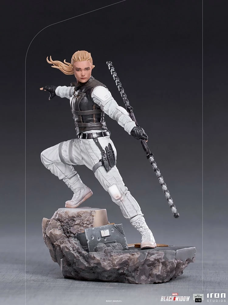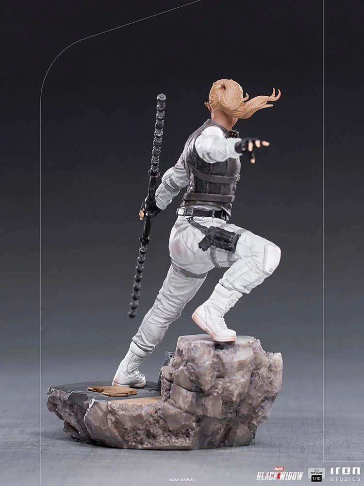 With a body expression full of movement, the figure of the blond Russian agent climbs a diorama base full of debris and elements of a combat scenario. Dressed in a white tactical uniform, with a black vest and gloves, she poses with her long stick in her left hand, as if spinning it, ready to confront an opponent who tries to surprise her in vain. Thus Iron Studios presents the statue “Yelena BDS Art Scale 1:10 – Black Widow – Iron Studios“, Natasha Romanoff’s ally in the Black Widow movie.